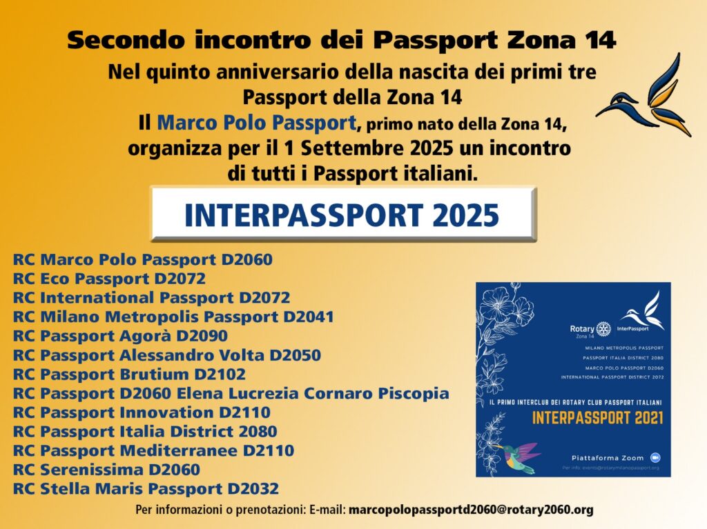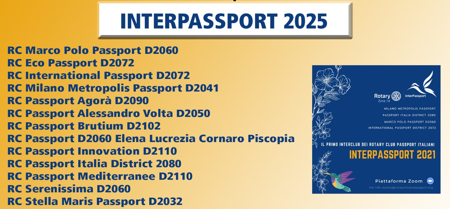 Prima iniziativa di rilievo fortemente voluta e patrocinata dalla Consulta è stata quella di favorire la realizzazione del primo InterClub tra Passport: il 29 aprile 2021 ha avuto quindi luogo il primo “InterPassport”, organizzato e condotto congiuntamente dai Presidenti dei quattro Rotary Club Passport al tempo attivi il 29 aprile (ai tre del 2020 si era aggiunto il RC International Passport D2072), evento aperto a tutti i rotariani e al mondo della società civile, in modalità online tramite piattaforma Zoom con una veste agile, accattivante e innovativa.